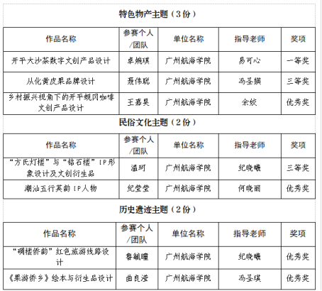 近日,广州航海学院师生团队在广东省“乡韵振兴 岭南风华”文化创意大赛中凭借出色的创意设计与扎实的专业实践能力,荣获一等奖1项、三等奖2项、优秀奖4项,获奖层次和数量喜人,充分展示了学校在文化创意领域的综合实力以及服务乡村振兴的实践担当。