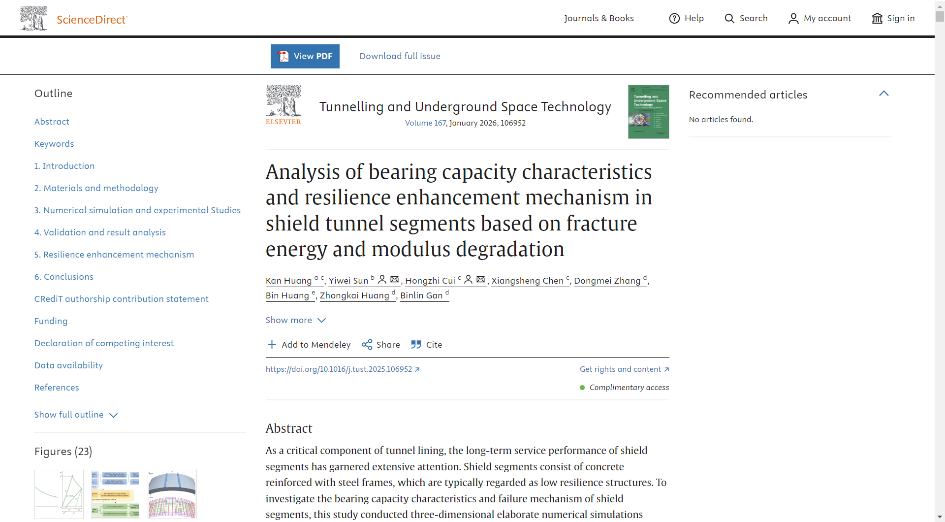 论文以广州航海学院为第一单位、依托黄戡主持的国家重点研发计划项目完成。黄戡、陈湘生创新构建“基于考虑断裂能与模量退化的混凝土塑性损伤模型”,通过三维精细化数值模拟,深入研究其承载力特征及韧性提升机理,并通过大型足尺试验对模拟结果进行了验证。其研究成果为城市轨道交通盾构隧道安全运维提供关键技术支撑,标志着学校在交通工程特色领域的科研实力获国际权威认可。