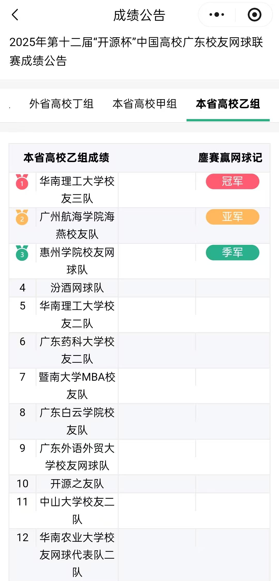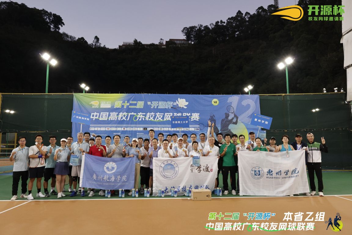 “开源杯”是华南地区一项高水平的高校校友网球赛事,旨在通过竞技与联谊弘扬体育精神、深化校友情谊,已成为连接省内外高校校友的重要桥梁。本届赛事竞技水平高、影响力广,共吸引了来自全国70余所高校的101支队伍参赛,竞争激烈、场面热烈。最终,广州航海学院校友队与广州体育学院、中山大学、华南理工大学、广东工业大学的校友队共同获得了参加“开源杯”年终总决赛的资格,将代表广东省参加后续的全国性总决赛。