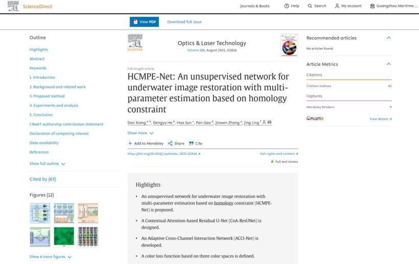 近日,广州航海学院向丹教授为第一作者,凌菁副教授为通讯作者,广州航海学院为第一署名单位在物理与天体物理领域TOP期刊《Optics & Laser Technology》(以下简称OLT)发表的学术论文《HCMPE-Net: An unsupervised network for underwater image restoration with multi-parameter estimation based on homology constraint》入选ESI高被引论文(Highly Cited Papers)和热点论文(Hot Papers)。