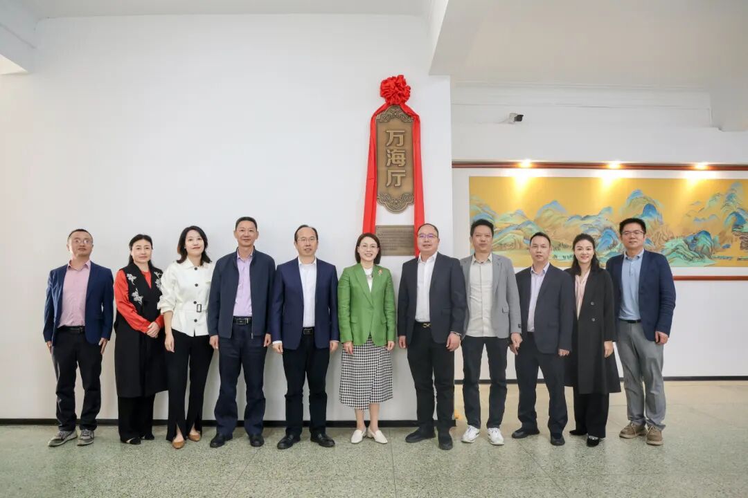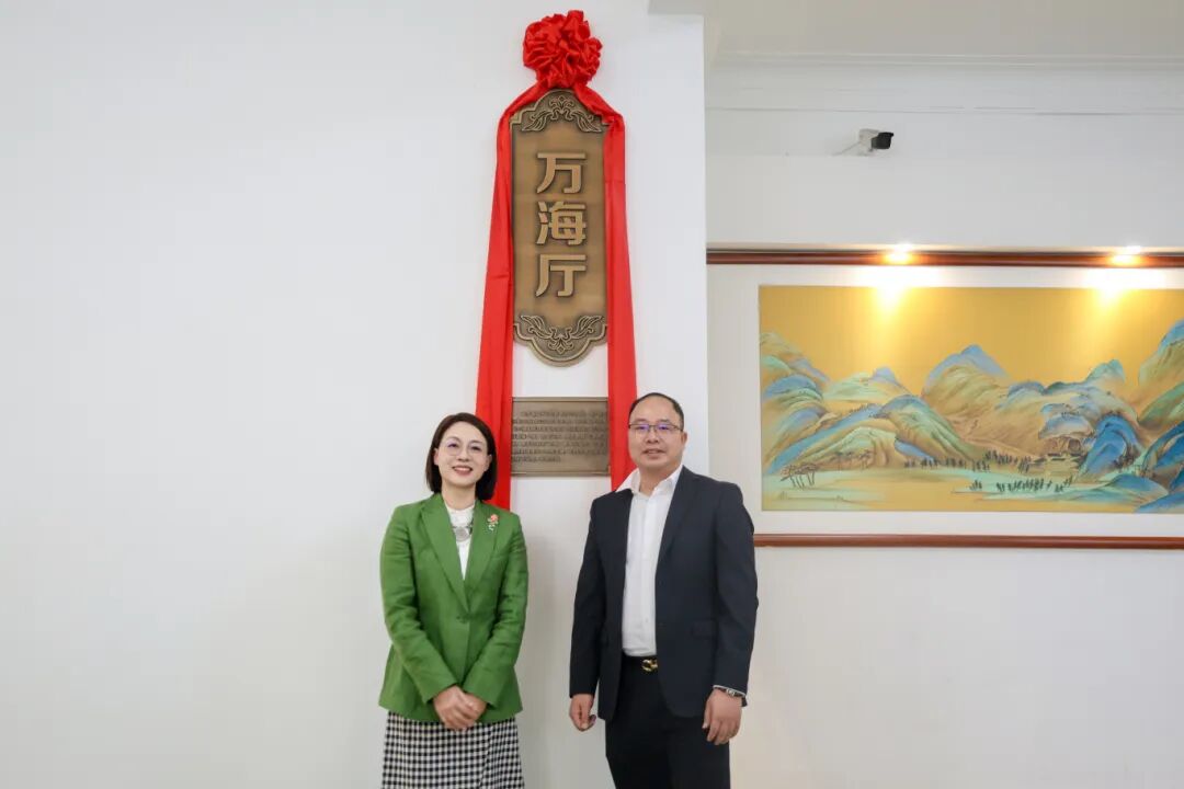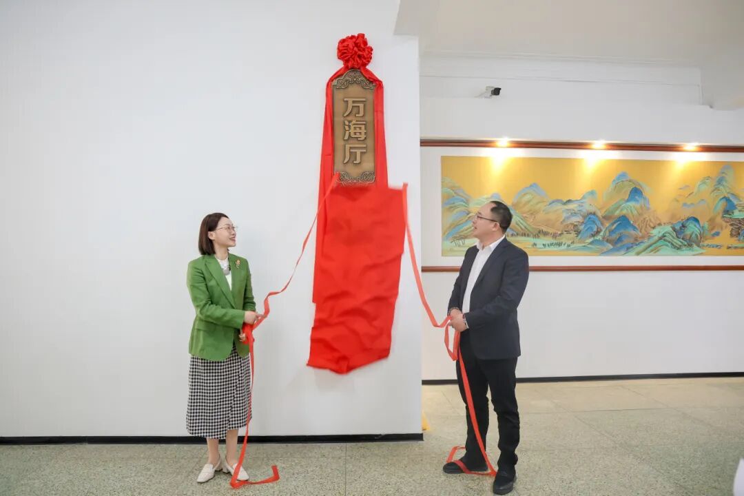 伴随着热烈的掌声,陶韶菁书记与卢任贵校友共同为 “万海厅” 揭牌。红绸落下,“万海厅” 三个大字熠熠生辉,标志着这一场馆正式投入使用,为学校发展注入新的活力。