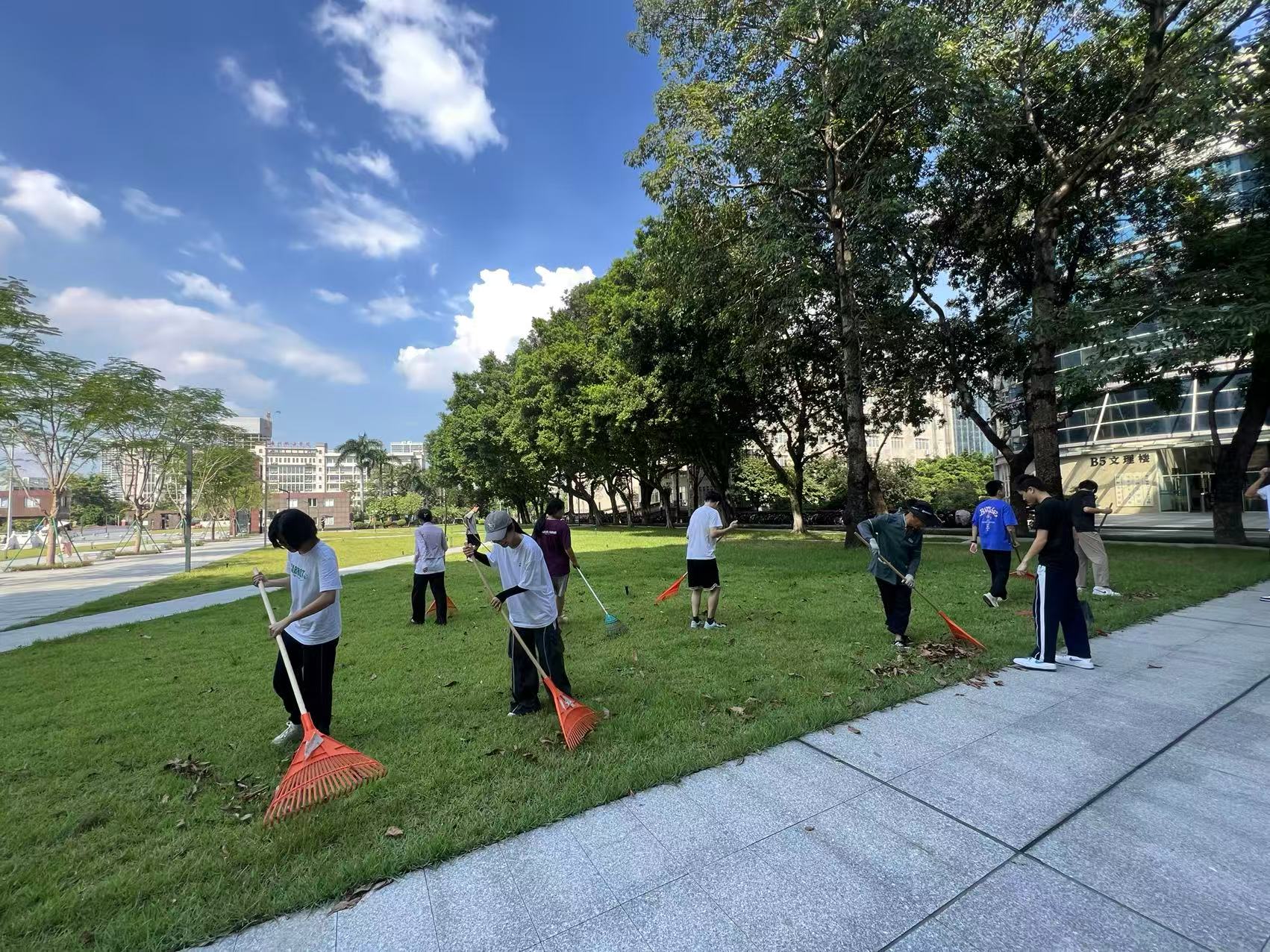 后勤人员与学生志愿者清扫草坪落叶