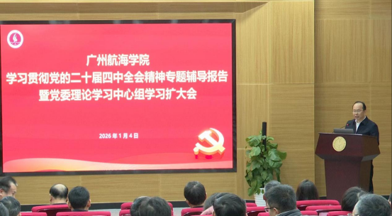 2026年1月4日,广州航海学院在黄埔校区B10图书馆胜海厅召开学习贯彻党的二十届四中全会精神专题辅导报告暨党委理论学习中心组学习扩大会。会议特邀广东省人民政府参事室专家组成员、特约研究员、学校大湾区航运研究院院长、广东海事局原局长梁建伟作专题辅导报告。学校党委书记陶韶菁,副校长唐强荣,纪委书记陆志英,副校长张劲文、陈建平出席会议,党委副书记胡命杰主持会议。