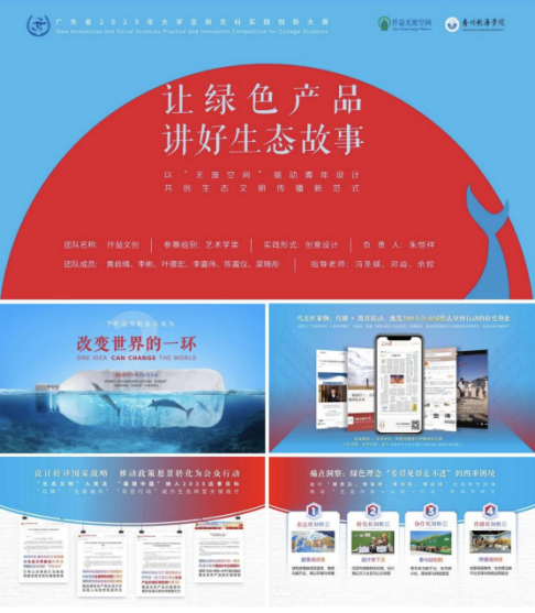 获奖项目《让绿色产品讲好生态故事》《非遗再造:岭南非遗文创产品设计及价值转化》《“非遗薪火・共绘新境”高校社区共融行动》,在冯圣瑛、曾朝辉、郭亚东等老师的指导下,立足绿色设计理念,聚焦岭南非遗,探索艺术化创意设计融合生态价值与文化传播,岭南非遗的现代设计转化与市场化路径以及校社协同育人与非遗活态传承。3个项目均以扎实的实践功底与社会价值担当,获得评委们的高度肯定。