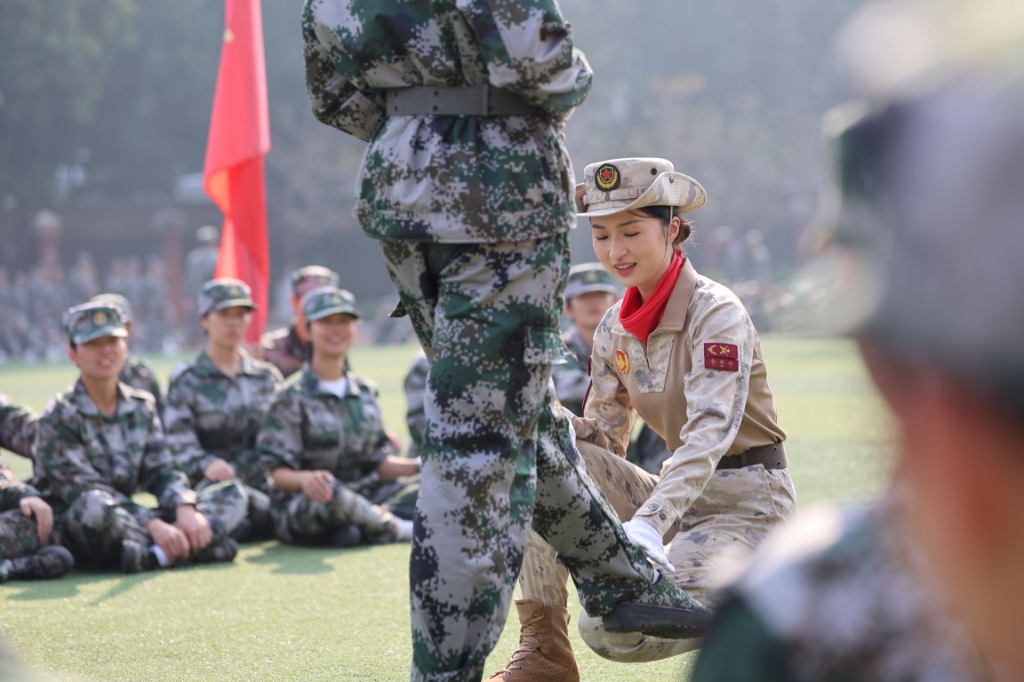 训练现场,黎炜怡以阅兵标准为基准,对军训核心动作进行拆解示范。她先整体展示持枪军姿、踢腿摆臂等完整动作,再针对每个环节的要领进行讲解,重点强调身体重心控制、动作幅度规范等关键细节。在指导过程中,她格外注重方阵整体的协同性,反复纠正队列排面的整齐度。随后,她走入新生队列,逐一查看每位学生的动作,对脚步落点、脚尖弧度、提胯发力等细节问题进行针对性指导,确保新生准确掌握动作规范。