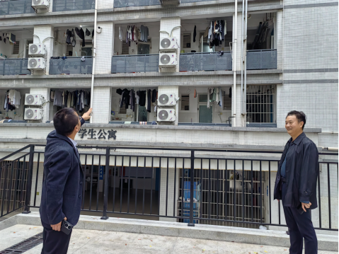 开学前,专项检查重点聚焦校园设施建设、安全保障及学生服务等关键环节。陶韶菁来到黄埔校区学生公寓,详细查看空调安装进展,认真听取项目负责人关于工程进度、质量管控及投用筹备情况的汇报。她强调,“一冷一热”是学生最关切的问题之一,直接关系到学生在校生活质量,要求相关部门严格坚守安全质量底线,加快工程推进节奏,细化投用各项准备工作,确保学生返校后能够顺利使用,切实增强学生的归属感与幸福感。校领导一行先后深入黄埔校区一站式学生社区、B11教学楼智慧教室,以及琶洲校区图书馆、学生公寓等重点区域,实地查看各场所建设完善情况和开学筹备细节。围绕校园安全工作,校领导重点巡查了餐厅、实验室等关键场所,仔细检查食品安全管理制度落实、消防设施完好有效等情况,现场倾听返校学生的合理诉求,督促相关职能部门及时回应并妥善解决学生提出的建议,全力为师生营造安全、舒适、便捷的校园环境。