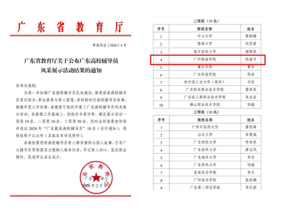 近日,广东省教育厅公布广东高校辅导员风采展示活动结果,广州航海学院辅导员胡嘉玥老师凭借扎实的职业素养、突出的育人实效和富有创新性的工作案例,从全省众多参赛辅导员中脱颖而出,荣获二等奖,充分展现了学校辅导员队伍的良好精神风貌和专业化育人水平。