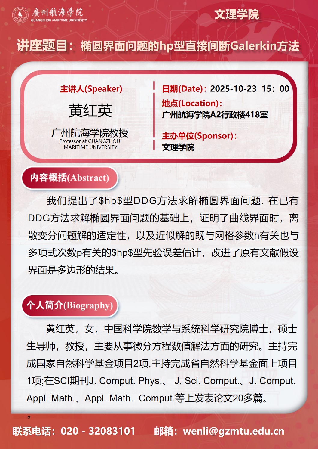学术讲座预告:黄红英《椭圆界面问题的hp 型直接间断Galerkin 方法》