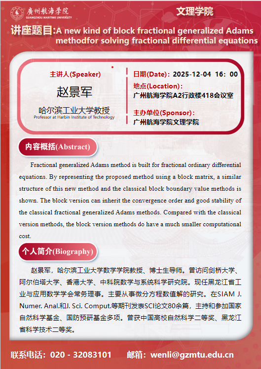 学术讲座预告:赵景军《A new kind of block fractional generalized Adams method for solving fractional differential equations》