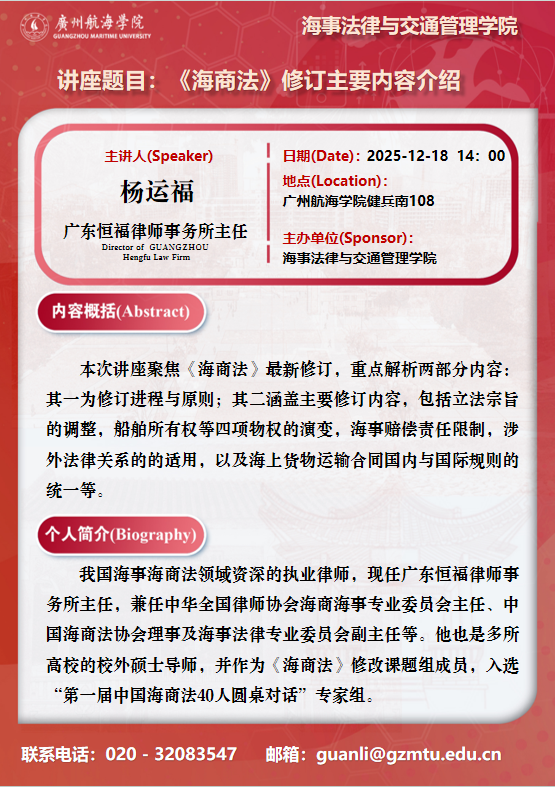 学术讲座预告:杨运福《<海商法>修订主要内容介绍》