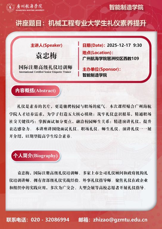 学术讲座预告:袁忠梅《机械工程专业大学生礼仪素养提升》