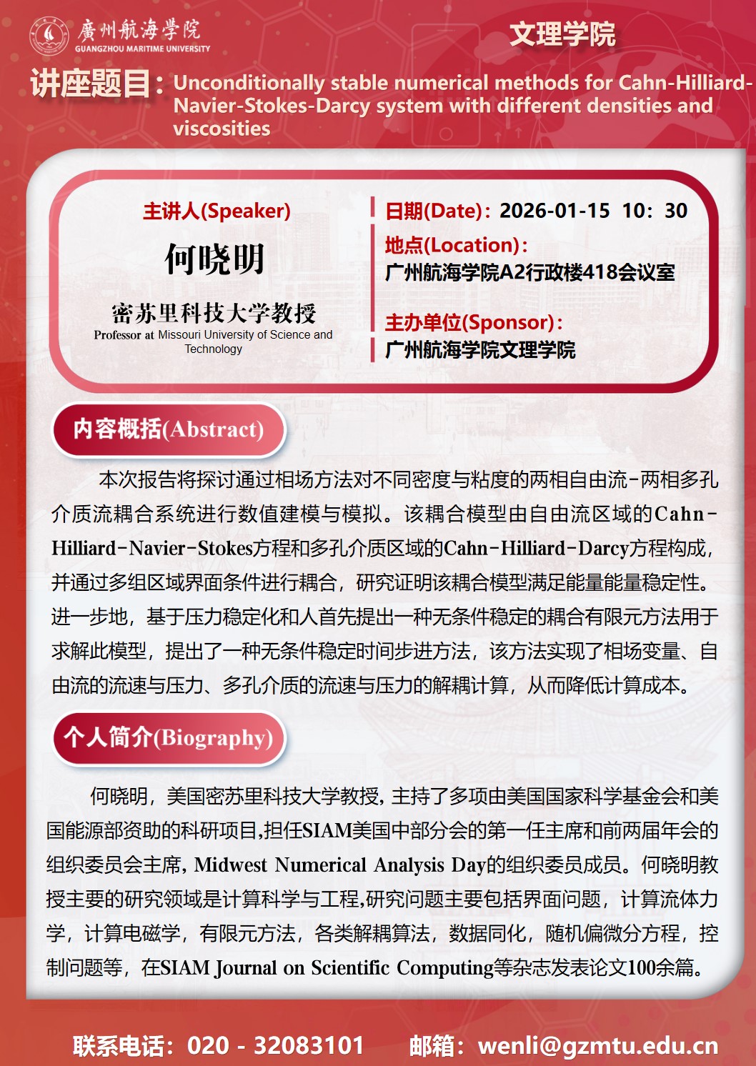 学术讲座预告:何晓明《Unconditionally stable numerical methods for Cahn-Hilliard-Navier-Stokes-Darcy system with different densities and viscosities》